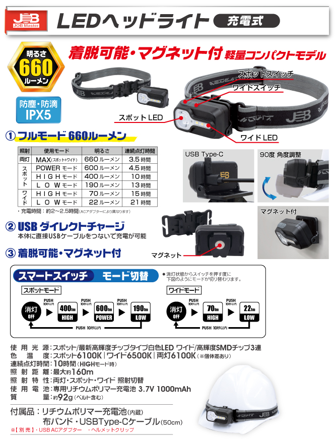 - 明るさ:最大660ルーメン(スポット+ワイド)
